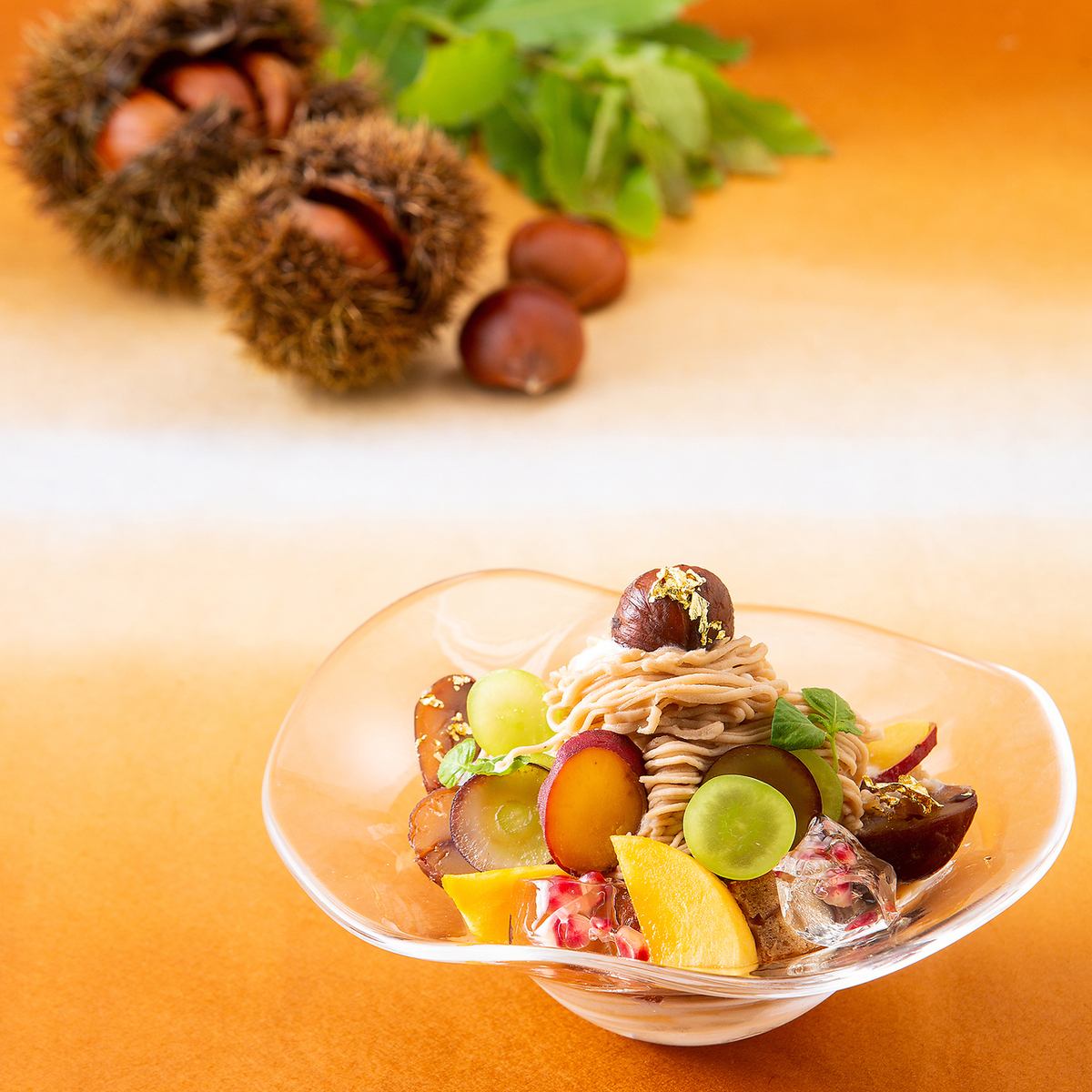 迷你芭菲 1,430日圓 帶皮煮栗子、峰岡豆腐栗子、日本栗子冰淇淋、蒙布朗奶油等,充滿栗子的芭菲。這道菜用蜂蜜燉煮的國產紅薯、冰淇淋以及麝香葡萄、葡萄和石榴等水果裝飾得色彩繽紛。